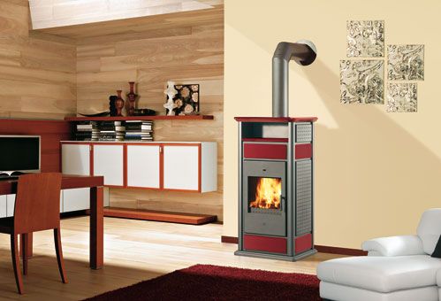 Το ατσάλινο πλαίσιο είναι η μηχανή αυτής της σόμπας που εμπλουτίζεται με κεραμική επισμαλτωμένη διακόσμηση σε δύο χρώματα, κόκκινο και κεχριμπάρι. Πλευρές, πρόσοψη βάση και εστία είναι εξολοκλήρου από μαντέμι.