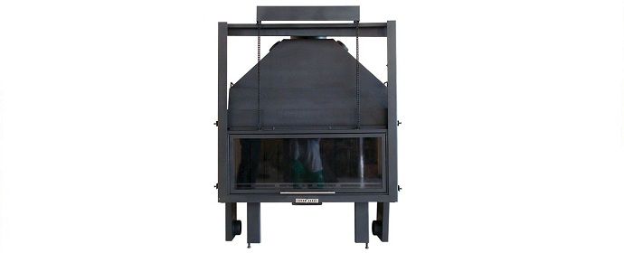 Αερόθερμο τζάκι, με ιδιαίτερα μεγάλο τζάμι στην πόρτα του. Μονομπλόκ κατασκευή, με χαλύβδινα ελάσματα τεσσάρων χιλιοστών και θωράκιση εσωτερικά με πλάκες από χυτοσίδηρο. Η πόρτα του είναι ανοιγόμενη και εξαφανιζόμενη (συρόμενη). Διαθέτει έξι αεροθαλάμους και αυτόματο τάμπερ στην έξοδο καπνού, για την καλύτερη δυνατή ανάκτηση της θερμότητας. Υπάρχει η δυνατότητα να λειτουργήσει είτε με φυσική ροή, είτε με κιτ βεντιλατέρ για καλύτερη απόδοση. Στο κάτω μέρος της εστίας, υπάρχει σχάρα και δοχείο συλλογής της στάχτης για ευκολία στον καθαρισμό. Έχει δύο εισόδους και τέσσερεις εξόδους για τον αέρα της θέρμανσης.